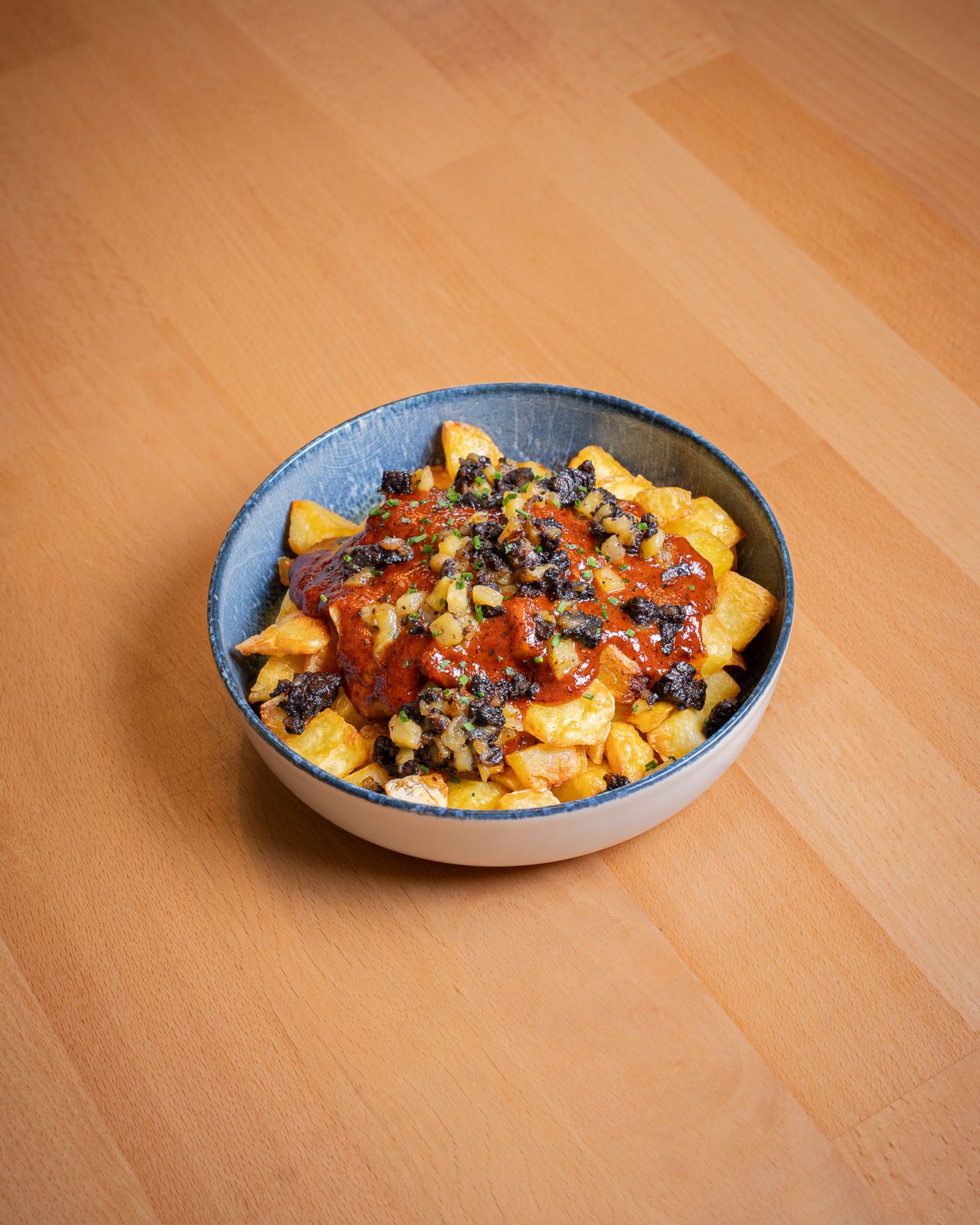 Crema de garbanzos especiada con secreto ibérico, aceitunas negras y cebolla crujiente. Acompañado de tortitas marineras. *Haz el plato vegano sustituyendo el secreto por alcachofa a la brasa.