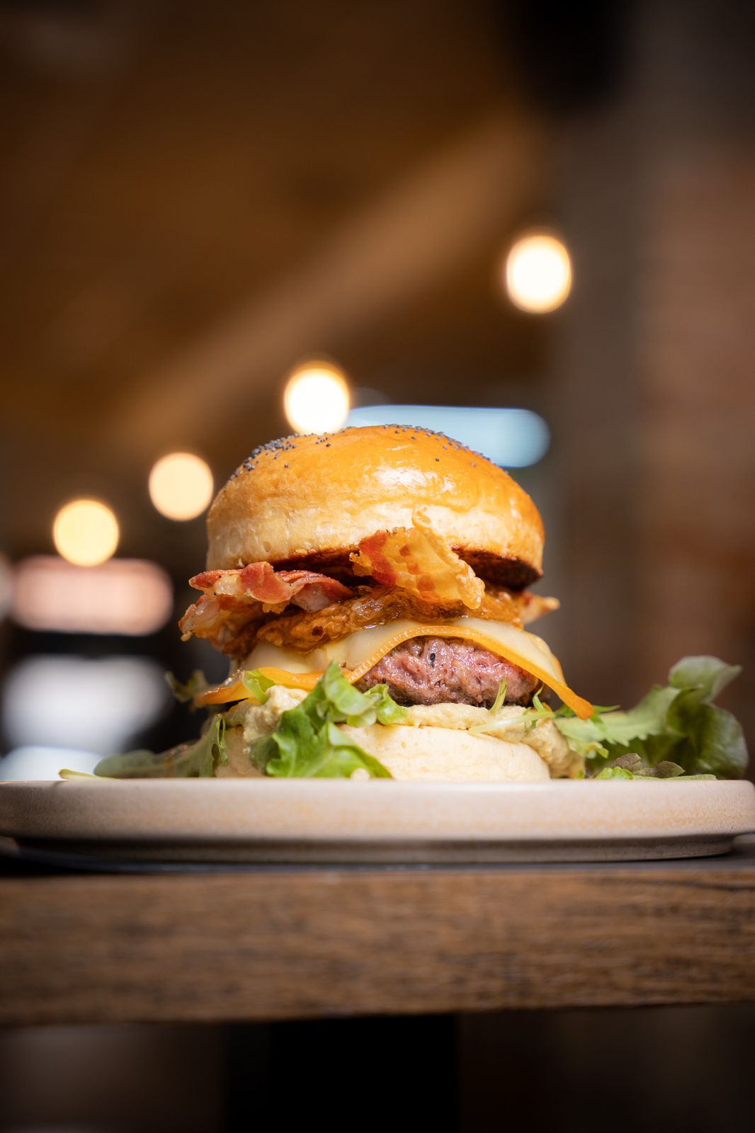 180gr de vaca madurada, mayonesa de huevo frito, lechuga roble, tomate, queso havarti, cheddar, cebolla caramelizada y bacon